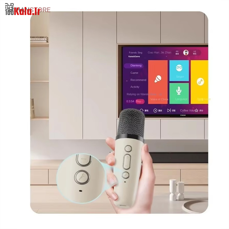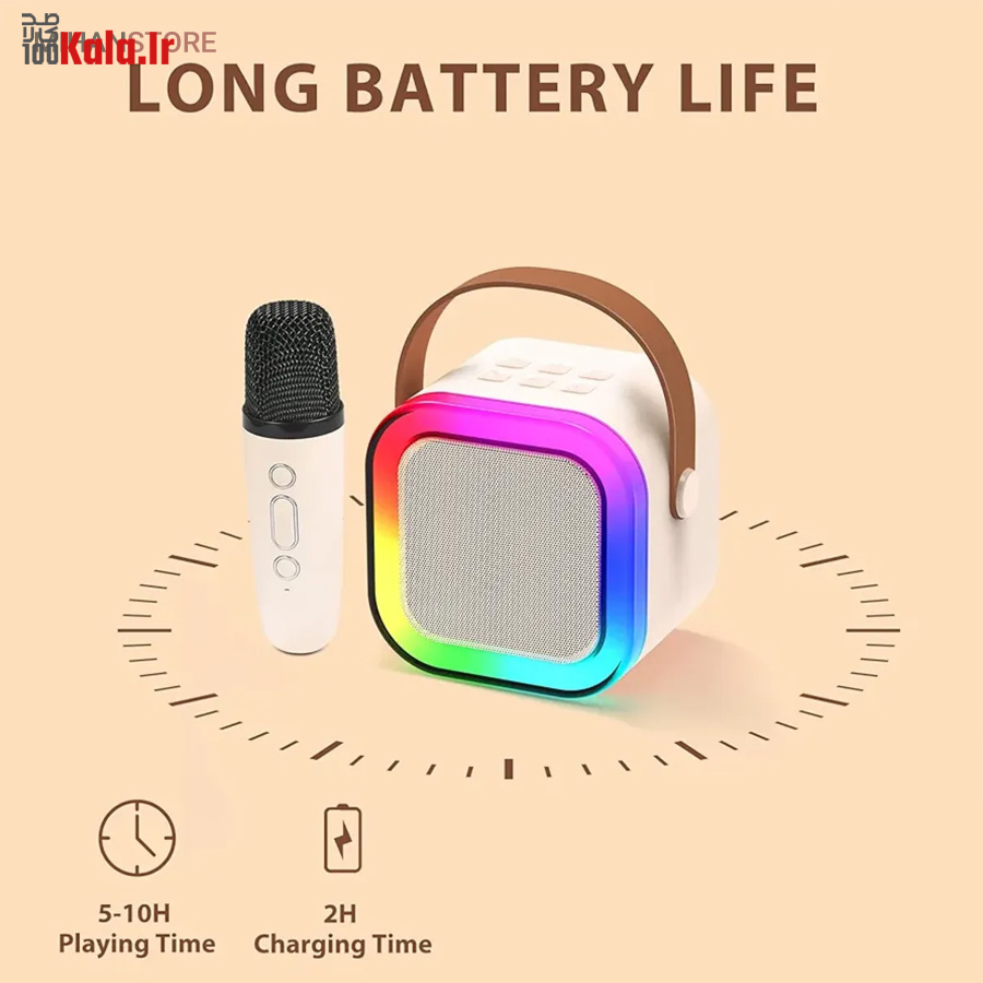 این یعنی راه های متنوعی برای اتصال به اسپیکر دارید و به دلخواه خود میتوانید از هر یک از آنها بهره ببرید. جالبترین بخش این محصول وجود یک میکروفون در کنار آن است. این میکروفون ظاهر بسیار جذابی دارد، بطوریکه حتی رنگ آن هم با رنگ بدنه اسپیکر ست شده است و درکنار هم مجموعه جالبی را ایجاد میکنند. این میکروفون شارژی است و توسط پورت تایپ سی روی بدنه میتوانید آن را شارژ کنید و با آهنگ هم خوانی کنید. اما این همه ماجرا نیست، چرا که افکتهایی هم روی این میکروفون قرار داده شده که به دلخواه میتوانید انتخاب کرده و لحظات شادی را برای خود و دوستانتان بسازید. روی بدنه میکروفون همچنین دکمههایی برای تغییر میزان صدا، روشن و خاموشی یا تغییر افکتها وجود دارد که استفاده از آن را راحتتر کرده است.این اسپیکر قابل حمل با باتری کار میکند و مجبور نیستید برای استفاده، آن را به برق متصل کنید.