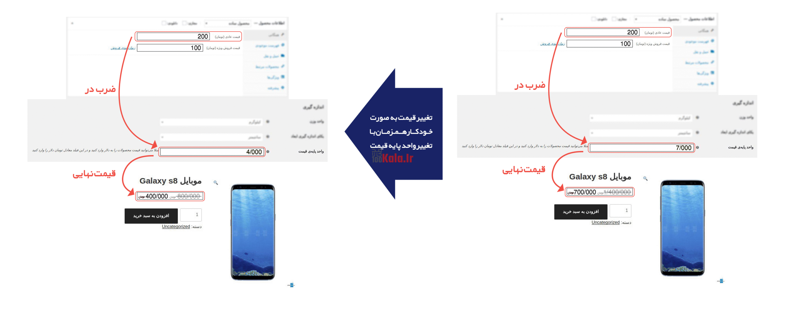 از این پس قیمت محصولات شما حاصل ضربی از قیمت خود محصول در واحد پایه‌ قیمت خواهند بود. حال با افزایش یا کاهش قیمت دلار تنها کافیست مقدار واحد پایه‌ی قیمت را تغییر دهید تا قیمت کل محصولات سایت به صورت هم‌زمان تغییر یابد. همچنین از این افزونه می‌توانید برای تغییر قیمت طلا هم استفاده کنید. فرض کنید قیمت محصولات سایت شما وابسته به قیمت طلا هستند.