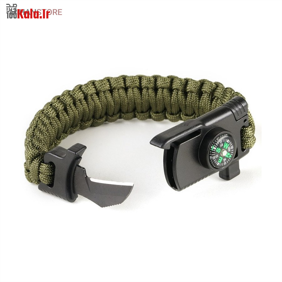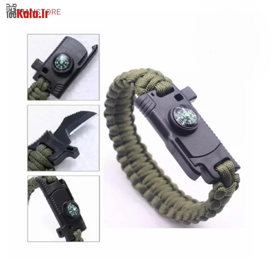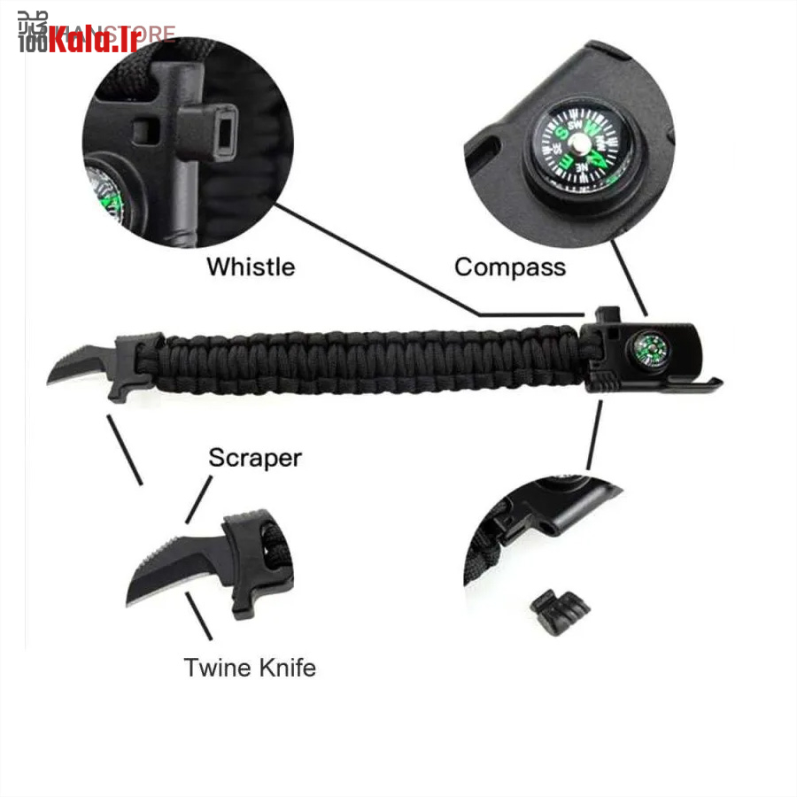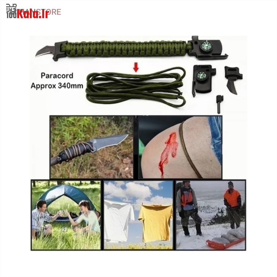 نیز استفاده کرد. دستبند پاراکورد و نجات معمولا از 7 تا 9 رشته طناب با طولی 3 تا 4 متری تشکیل شده است که می‌‌توان برای مصارف مختلف در سفر از آن استفاده کرد. دارای ضروریات مربوط به یک سفر بوده و همچنین می‌‌تواند به دلیل زیبایی آن نیز مورد استفاده قرار گیرد، این وسیلۀ کاربردی می‌‌تواند کادوی بسیار مناسبی برای افرادی باشد که بسیار در طبیعت سفر می‌‌کنند. قطب نما، سوت اضطراری این سوت سطح سر و صدا را می‌تواند تا 110 db ایجاد کند و به امدادگران سیگنال دهد و چاقو که برای برش طناب و مواقع ضروری مورد استفاده قرار می‌گیرد و پشت چاقو در قسمت بالا هم دندانه‌هایی قرار دارد.