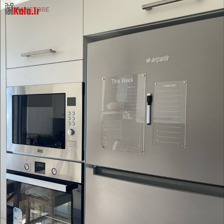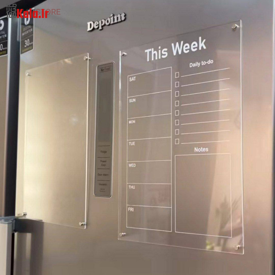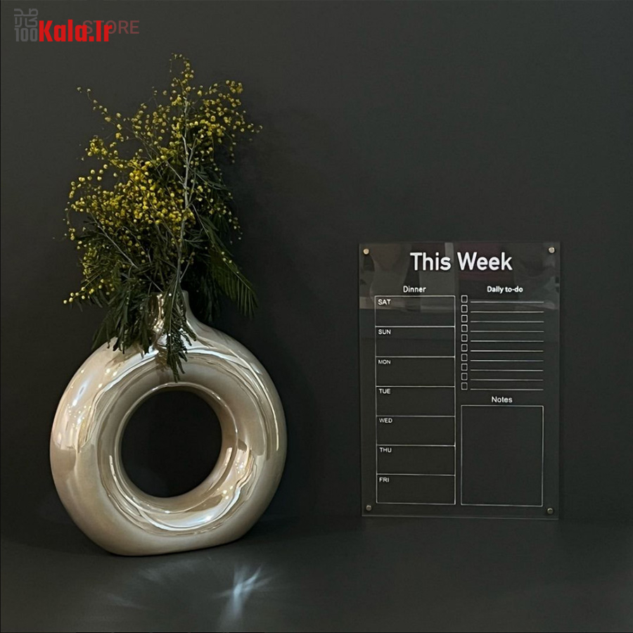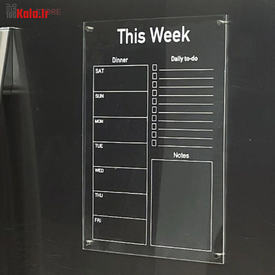 تخته برنامه ریزی هفتگی مغناطیسی شفاف این امکان را به شما می دهد تا با داشتن یک برنامه منظم هفتگی کارهای خود را سازمان دهی کنید. همچنین با داشتن بخش جزییات کارهای روزانه به شما در طبقه بندی، رسیدگی و انجام کارهای تان کمک می کند. امکان ثبت رویداد های هفته، ثبت قرار ملاقات و دارا بودن بخش یادداشت های متفرقه از مزیت های این محصول است. پلکسی گلس اجرا شده در این محصول به ضخامت دو میلی متر است و در آن چهار عدد آهن ربای نئودیمیوم درجه یک بکار رفته است. آهن ربای این محصول با قدرت بالا نسبت به وزن محصول احتمال سرخوردگی را به صفر می رساند. طرح چاپ شده در دو رنگ سفید و مشکی در پشت پلکسی گلس اجرا شده است. با یک ماژیک وایت برد قابلیت نوشتن و پاک کردن مکرر روی این تخته وجود دارد.